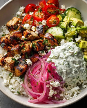 A healthy and flavorful dish made by combining fresh ingredients like whole grains, vegetables, proteins, and sauces.